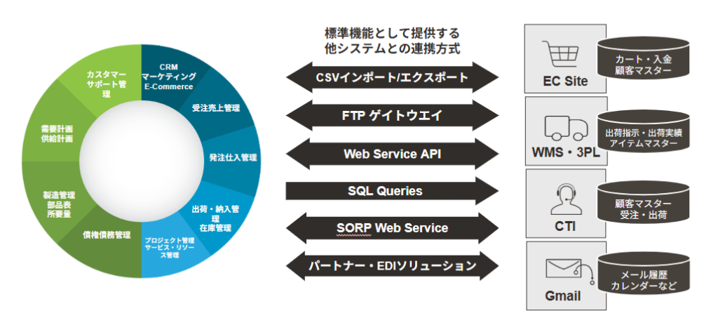 例えば、使い慣れた会計システム、CRMシステムはそのままに、ERPシステムでデータ連携も可能。