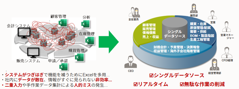 財務・調達・販売・生産・営業・在庫などの経営情報を一元データ管理し、効率化を実現できます。